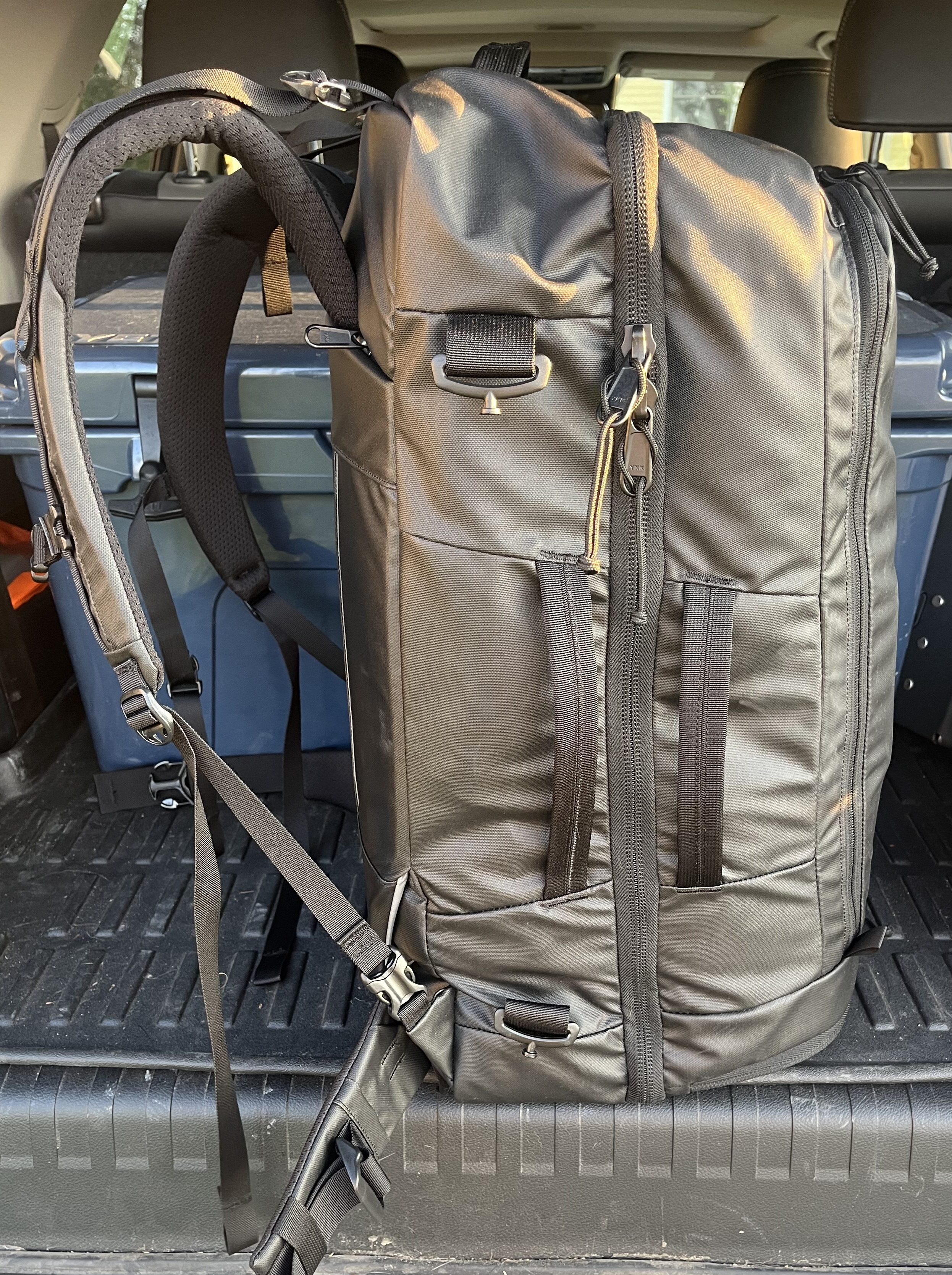 The backpack harness system is a massive highlight. The robust and comfortable straps and hip belts make carrying this pack a breeze, even when fully loaded. The addition of load lifters is something that you don’t see in many packs of this kind and in my opinion, this is a big differentiator. The straps are easy to stow or deploy when needed, and there’s a luggage pass-through if you’re pairing it with a roller. You can also use the bag as a shoulder bag with a detachable strap, though the lack of padding on the strap makes it less ideal when maneuvering heavier loads.
