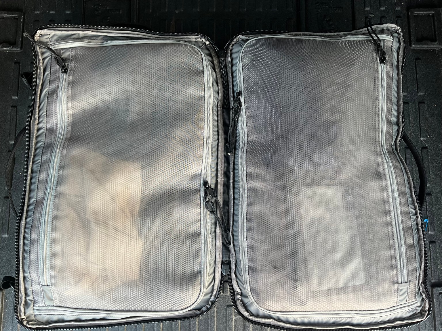 The design is well thought out, with the right side compartment being slightly smaller than the left, allowing heavier items to be packed closer to your body when using the backpack straps. I recommend placing heavier items on the lower left side and lighter ones on the right to keep the heavier items closer to your back and hips. There’s also a small compartment at the bottom of the bag, perfect for separating dirty laundry or shoes, though it might be a tight fit for larger footwear.